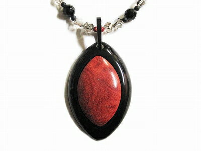 マーキス型の大きなアフリカ珊瑚を黒水牛の枠に入れて、アフリカ珊瑚の玉とオニキスの玉とカットを施したオニキスとクリスタルで組み上げた竿にぶら下げたアフリカ珊瑚ネックレスです。