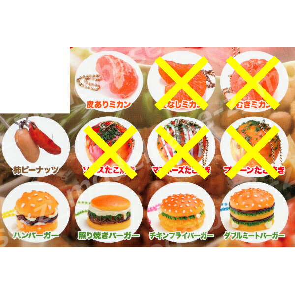 ● 皮ありミカン ● 柿ピーナッツ ● ハンバーガー ● 照り焼きバーガー ● チキンフライバーガー ● ダブルミートバーガー の 6種類です。