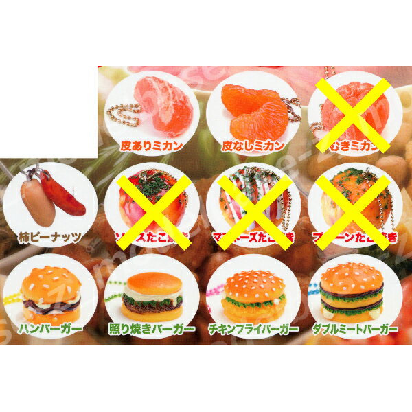 ● 皮ありミカン ● 皮なしミカン ● 柿ピーナッツ ● ハンバーガー ● 照り焼きバーガー ● チキンフライバーガー ● ダブルミートバーガー の 7種類です。