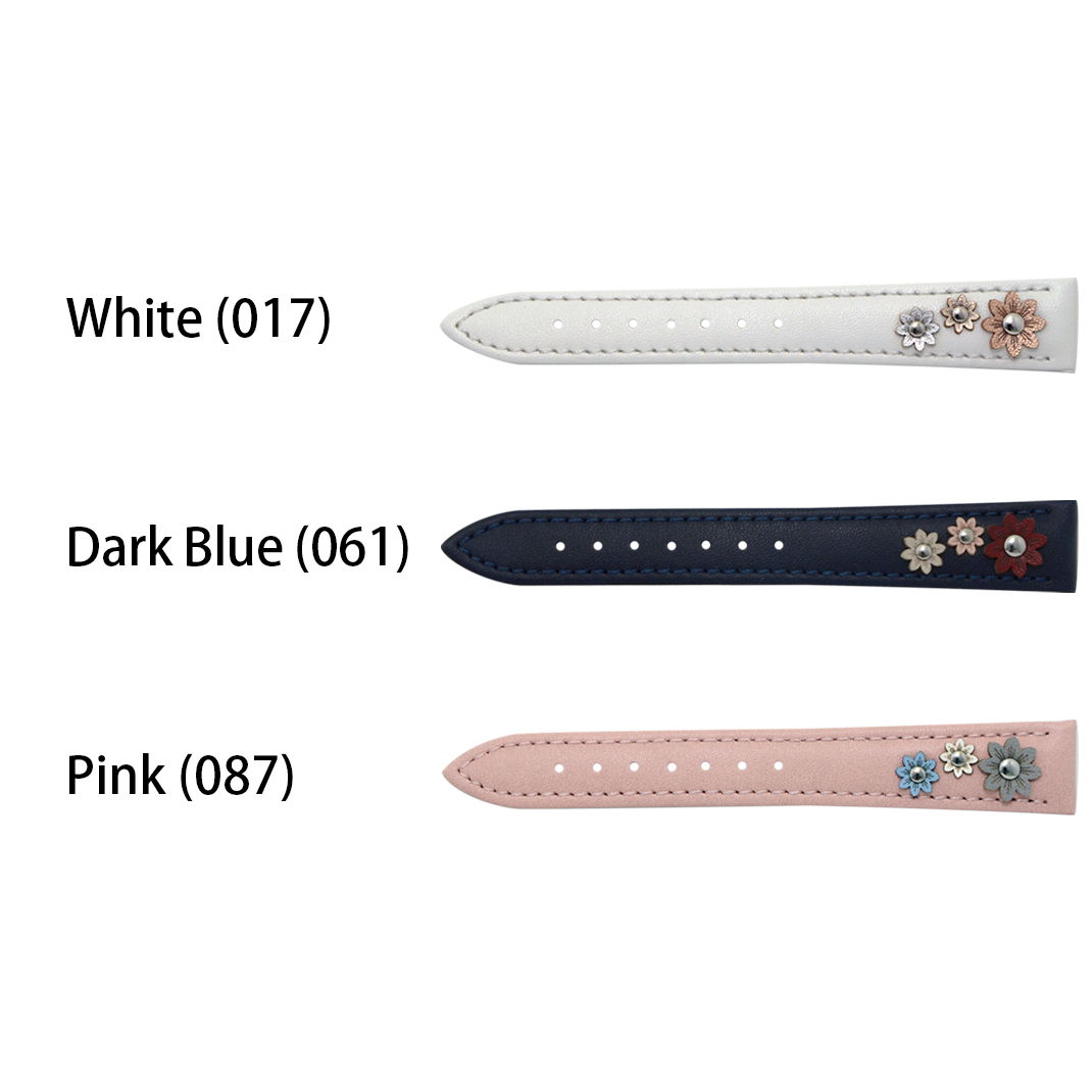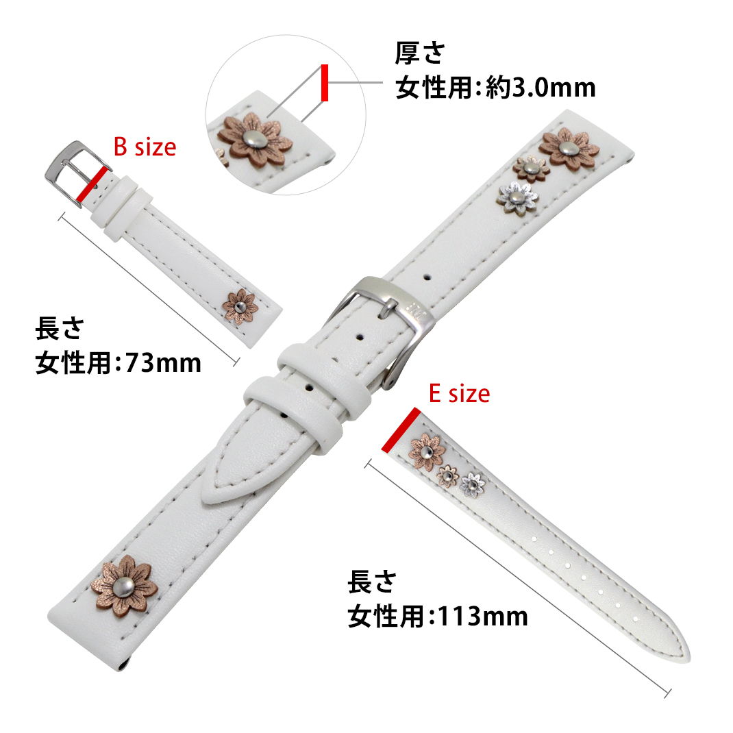商品スペック カラー ホワイト White (017) ダークブルー Dark Blue (061) ピンク Pink (087) 素材 シンセティックレザー 長さ 【女性用サイズ】 剣先側113mm / 尾錠側73mm 厚さ 【女性用サイズ】 約3.0mm サイズ展開 【女性用サイズ】 E14mm-B12mm E16mm-B14mm E18mm-B16mm ※【E】は時計に装着する側の幅、【B】はバックルの幅です。